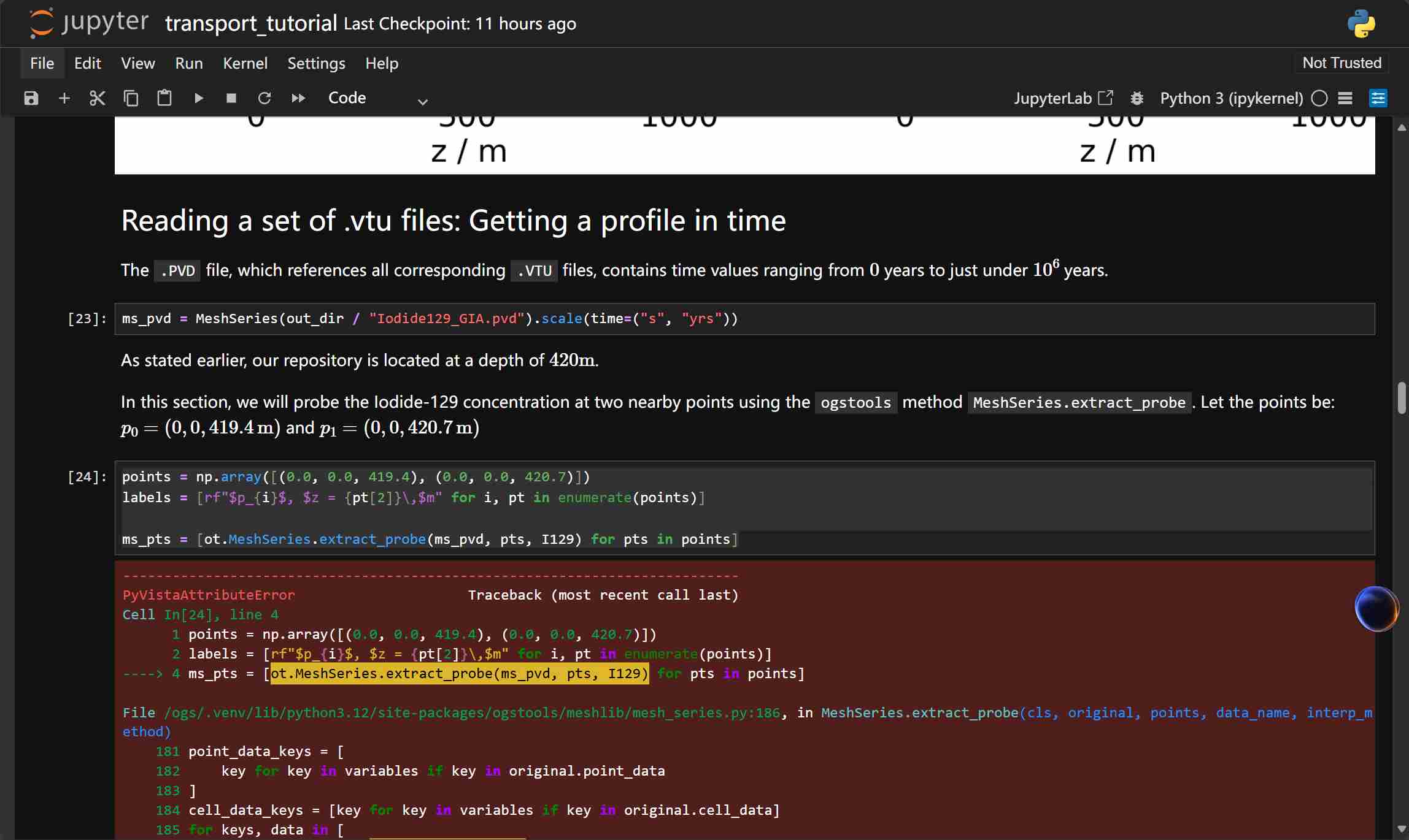 While following the official OGS tutorial “Reading OGS Output: Diffusion, Sorption, and Decay in a 1D Reactive Transport Model”, I encountered a PyVistaAttributeError